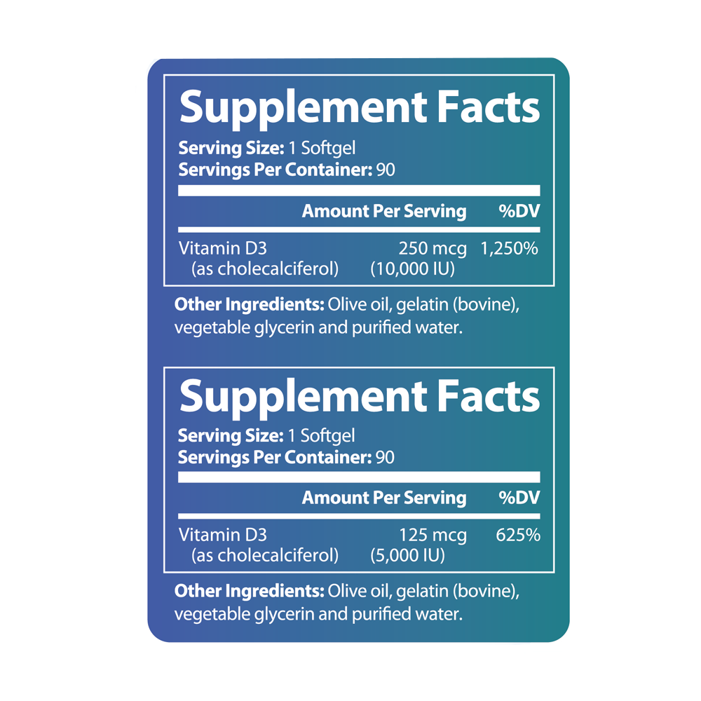 Vitamin D3 5,000 IU/10,000 IU is a high potency cholecalciferol supplement designed to support optimal vitamin D levels for bone health, immune function, cardiovascular support, and overall wellness. Vitamin D3 is the biologically active form of vitamin D and is more effective at raising and maintaining serum 25(0H)D levels compared to vitamin D2.* This formula is ideal for individuals with limited sun exposure, increased vitamin D needs, or those seeking advanced daily support for immune and skeletal health.*